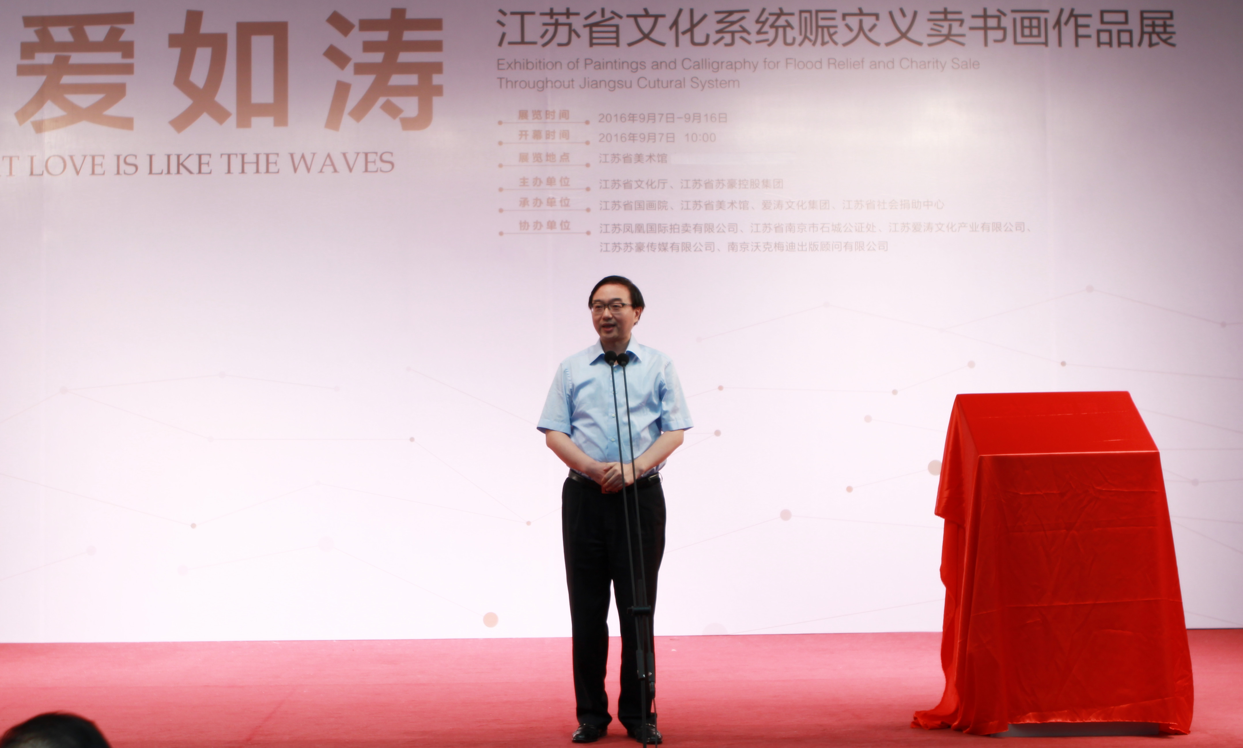 由江蘇省文化廳、江蘇省蘇豪控股集團(tuán)共同主辦,江蘇省國(guó)畫(huà)院、江蘇省美術(shù)館、愛(ài)濤文化集團(tuán)、江蘇省社會(huì)捐助中心共同承辦的“大愛(ài)如濤——江蘇省文化系統(tǒng)賑災(zāi)義賣(mài)書(shū)畫(huà)作品展”,于9月7日在江蘇省美術(shù)館正式開(kāi)幕,為期10天。并同步出版發(fā)行由蘇豪控股集團(tuán)董事長(zhǎng)王正喜主編的《大愛(ài)如濤——江蘇省文化系統(tǒng)賑災(zāi)義賣(mài)書(shū)畫(huà)作品集》。