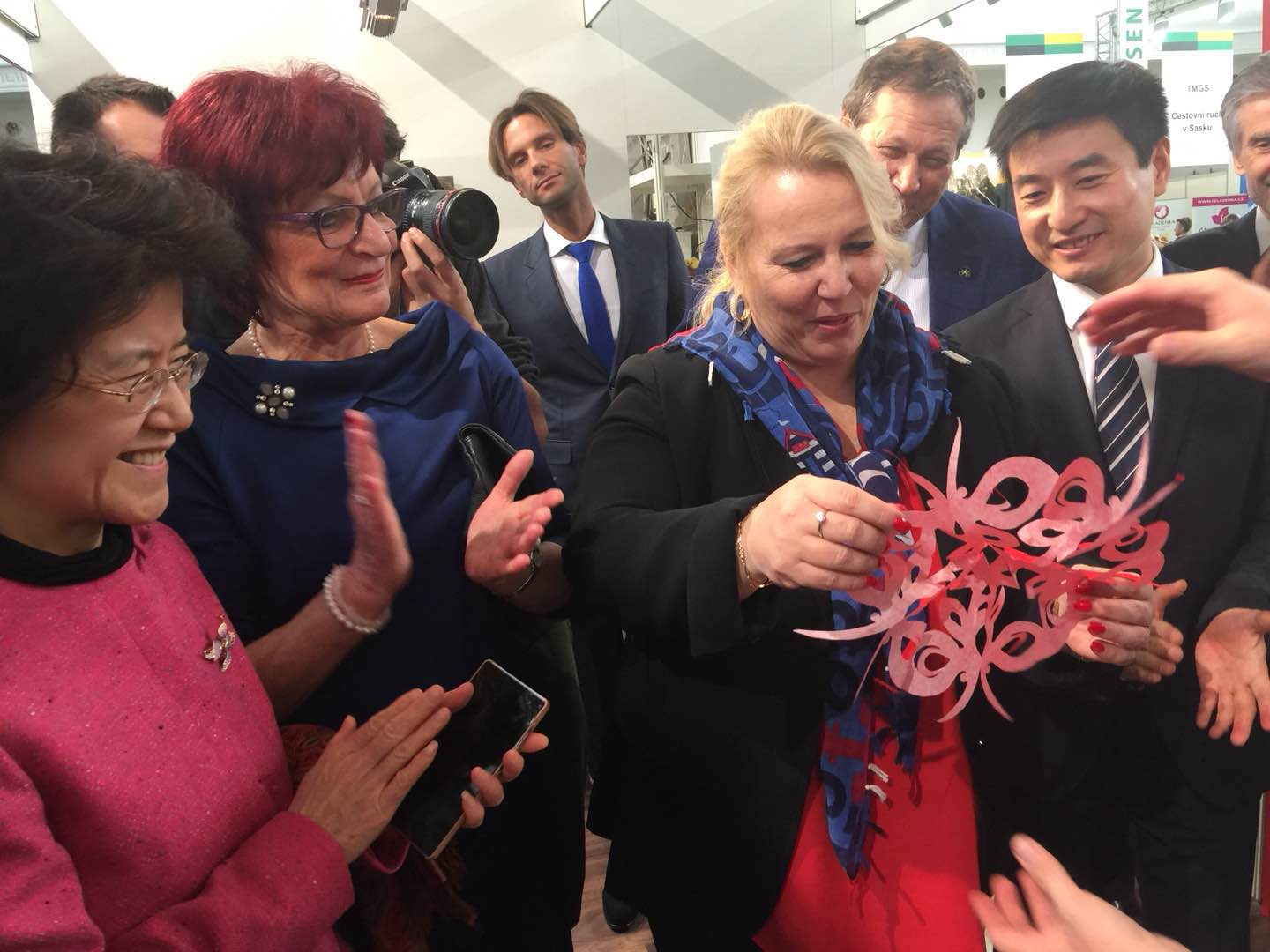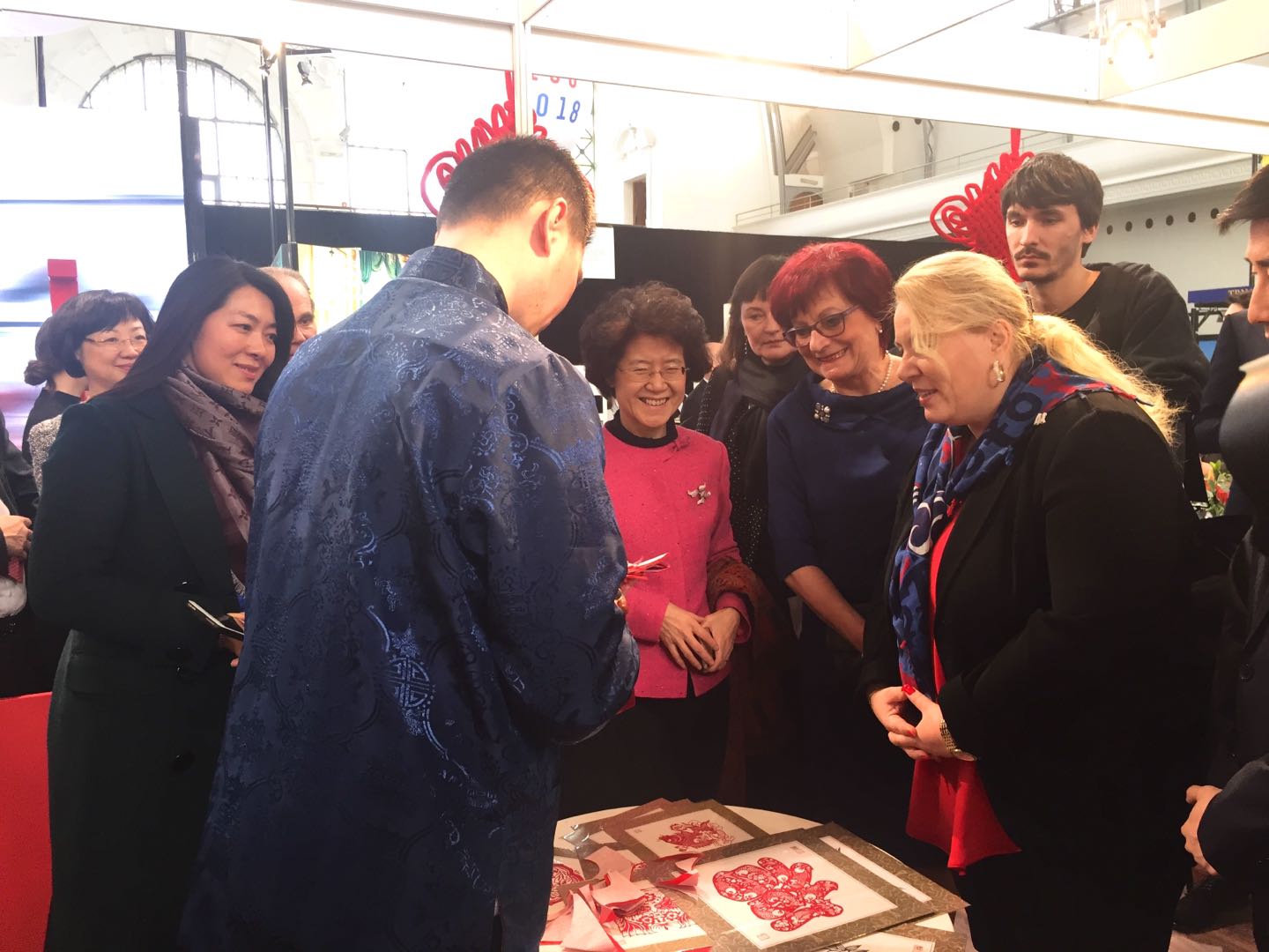 捷克地方發展部部長多斯塔洛娃饒有興趣地觀賞剪紙表演,與表演者熱情交流