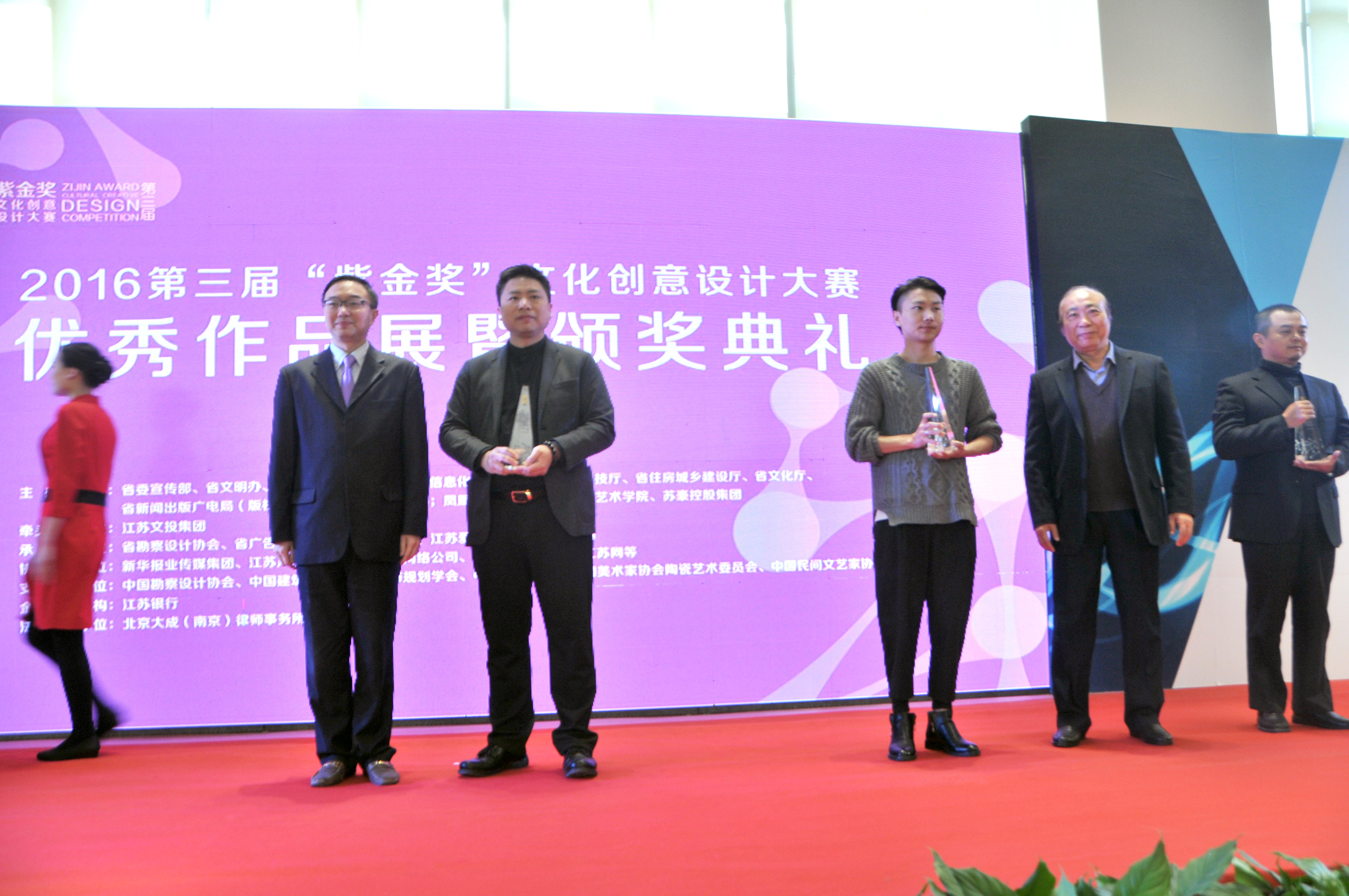 11月11日,第三屆“紫金獎”文化創意設計大賽優秀作品展暨頒獎典禮在南京河西新城紫金文創園舉行。大賽由江蘇省委宣傳部、江蘇省蘇豪控股集團等14家單位聯合主辦,江蘇文投集團牽頭承辦,江蘇愛濤文化產業有限公司具體承辦現代手工藝設計大賽暨優秀作品展。蘇豪控股集團總裁出席頒獎典禮,并為現代手工藝設計大賽金獎獲得者頒獎。