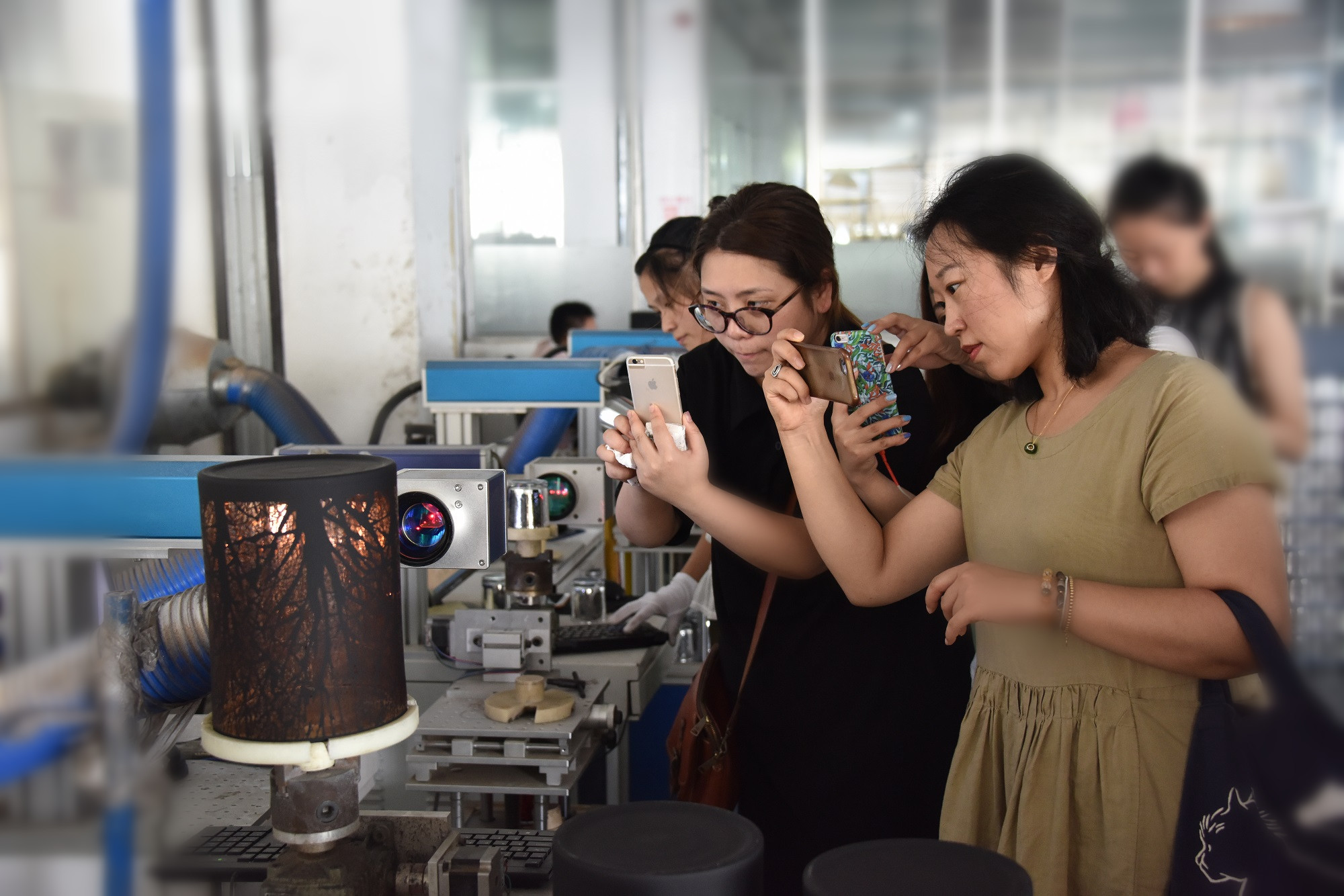 在創(chuàng)意設(shè)計(jì)研發(fā)中心的劉總帶領(lǐng)下,學(xué)員們參觀晶彩玻璃的生產(chǎn)過程